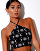 Ensure your looks on point from sunrise to sunset with our April moonlight top! Featuring a bodycon cropped fit, halter neckline in a monochrome sun, moon and star print. Pair with our Bogo pants in black, double grommet belt and docs for a look we LOVEEEEE!