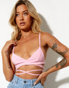 With the Jamaria top it's all in the detailing. In a baby pink, it features a cropped bralette fit with plunge neckline, thin shoulder straps and wrap around straps. For a fresh finish, pair with the loose fit denim short.