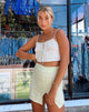 Cute and flirty, the Sheny skirt is a must have for the warmer months. In a pastel green and white check print, it features a high waist, mini fit and side split. Easily finished with the Guan top in white.