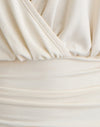 The Sherlyn top in an oatmilk cupro fabric. Featuring a draped crossover front and a deep cut cowl neck, with halter straps and a backless design. Paired with our Tova trousers.