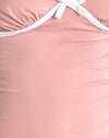 In a coconut milk soft lycra, the Tasini top features a fitted design with a regular length hem, short sleeves and a deep V neckline. Finished with contrast black binding along the neckline and under bust, and a decorative bow. We have paired with our Nidya skirt.